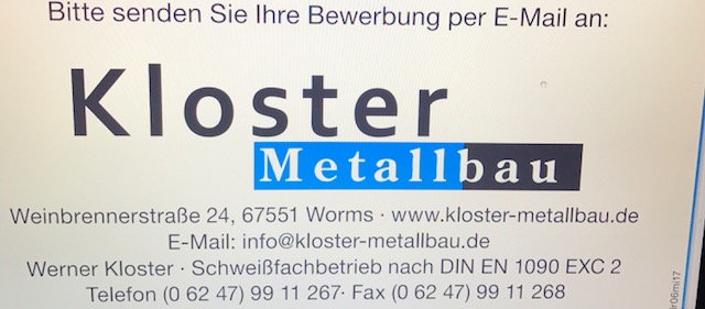 schriftliche Bewerbung: Kloster Metallbau, Weinbrennerstr. 24, 67551 Worms-Pfeddersheim